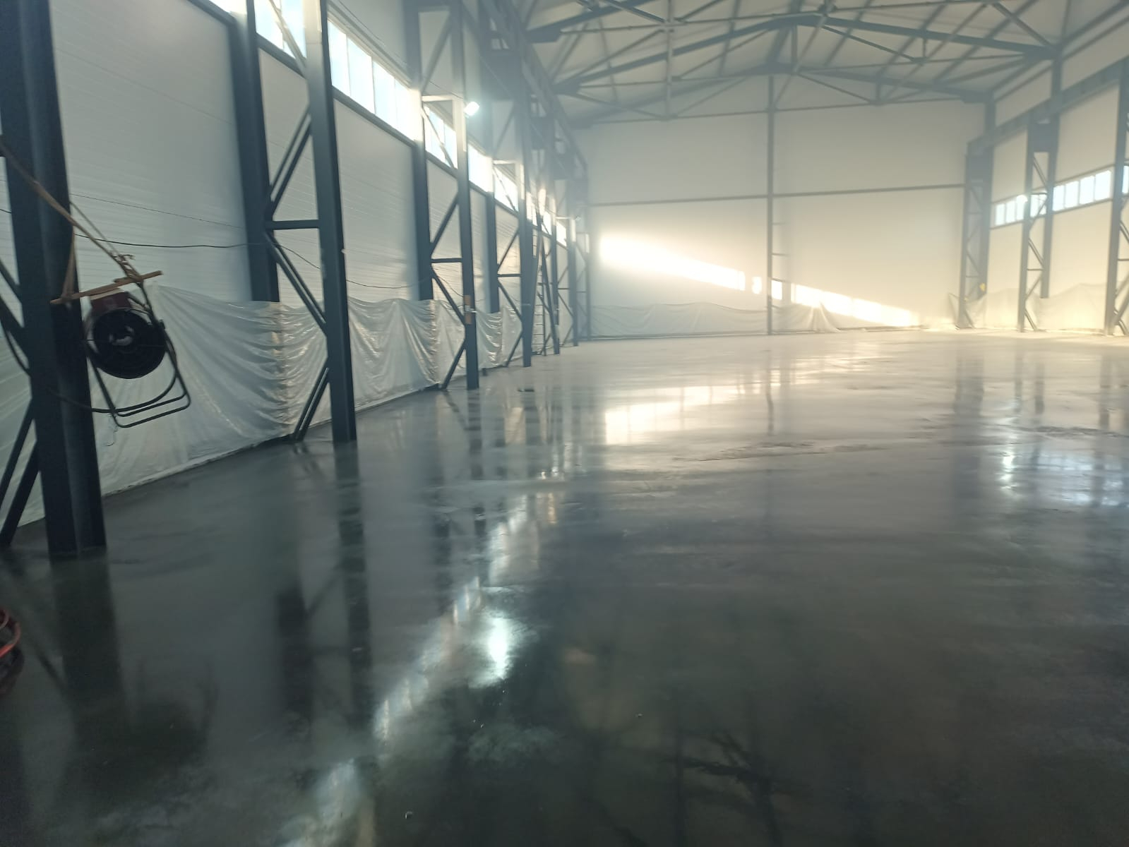 Готовое покрытие предназначено для эксплуатации под высокими нагрузками от штабелеров, погрузчиков , падения тяжелых предметов, воздействия масел и умеренных абразивных воздействий, характерных для цеха металлообработки.