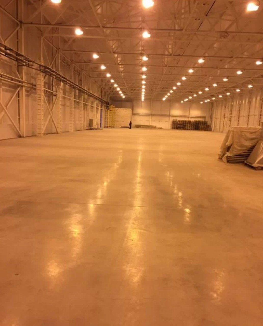 Устройство высокопрочного бетонного пола с упрочнённым верхним слоем (топпингом) для зернохранилища площадью 1400 м2 .