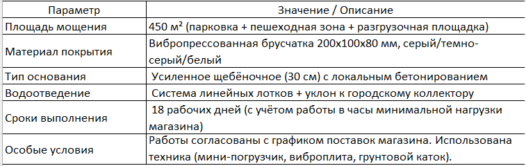 Задача клиента: Создать износостойкое, презентабельное и безопасное покрытие для зоны погрузки-разгрузки, парковки покупателей и пешеходных подходов к магазину, способное выдерживать постоянное движение легкового и грузового транспорта.