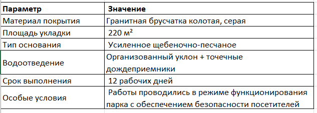 Объем работ: Укладка гранитной брусчатки на площадь 220 м² с подготовкой усиленного основания
