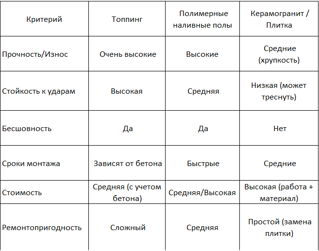 Полы с топпингом- это технология поверхностного упрочнения свежеуложенного бетона. На этапе его схватывания на поверхность втираются специальные сухие упрочняющие смеси — топпинги от производителей Monopol, King, Alfapol, NOVOMIX, Полимер ПРО, ТехБетон. Они состоят из высокопрочного цемента, износостойких заполнителей (кварц, корунд, металлическая стружка) и модифицирующих добавок. В результате химической реакции и механического уплотнения образуется сверхпрочный, беспыльный верхний слой, интегрированный с основой.